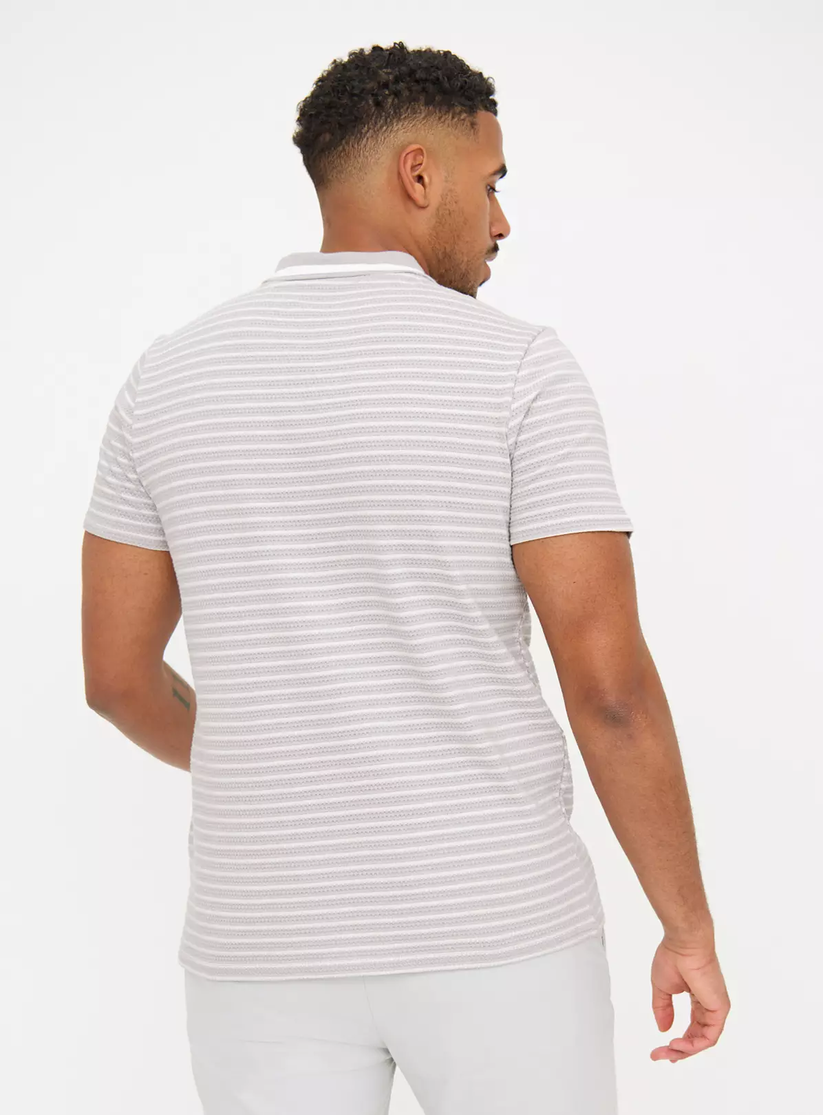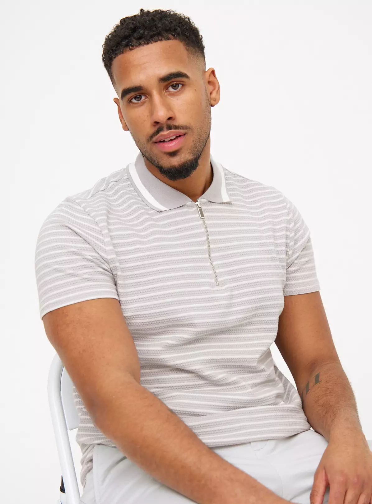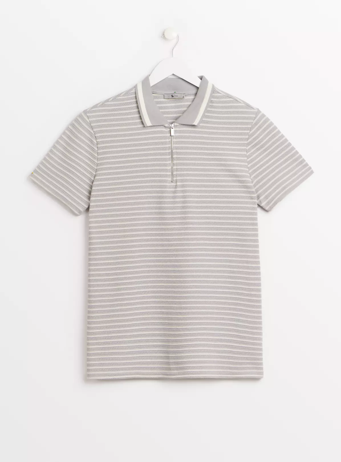 For a classic look reach for our grey stripe polo shirt. In a textured fabric, it features a zip fastening for a modern touch. Perfect for spring, pair it with denim jeans or chino trousers.